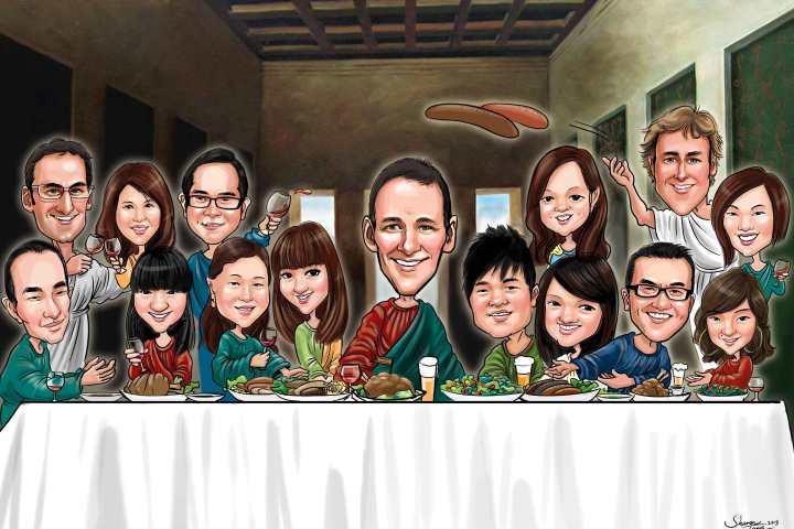 The customer wants, “6 of us on the Great Wall of China waving goodbye to the 1 leaving…Can make leaving person wears a chef top hat and a muscular body wearing singlet. Can he also holds a pie or cake as he’s quite a baker.”